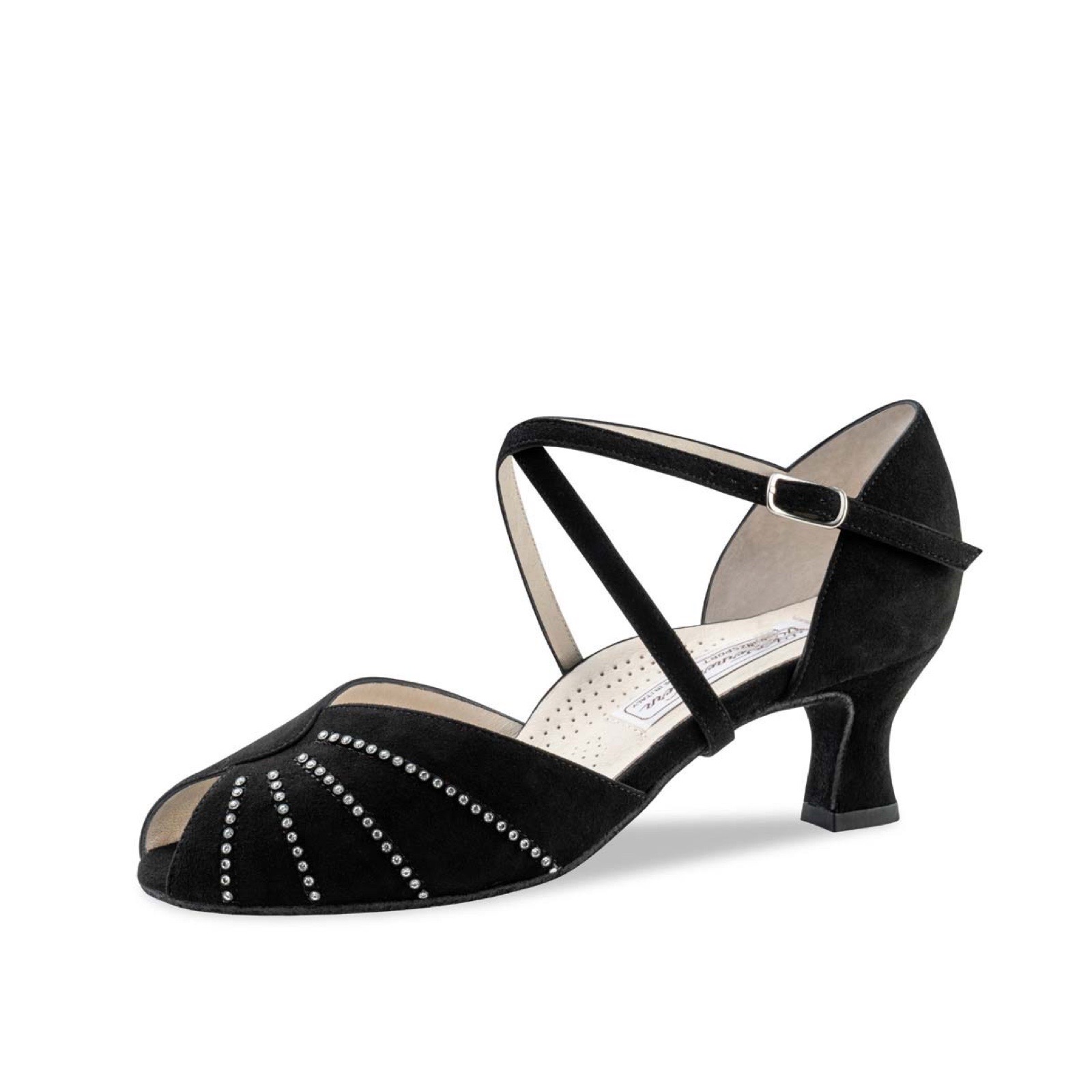 Funkelnder und traumhaft bequemer Werner Kern Tanzschuh. Der komfortable Ausschnitt sowie die kleine Zehenöffnung schmeicheln dem Fuß und bieten in Verbindung mit den unter der Sohle und an der Ferse individuell verstellbaren Kreuzristriemchen perfekten und bequemen Halt. Strasssteine verleihen dem Schuh Klasse.